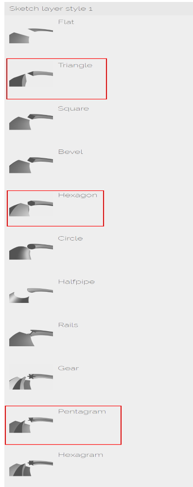 When I'm working in BT with a Sketch layer I'm missing the Triangle, Hexagon and Pentagram Styles. In the Help files on the website are these mentioned.
