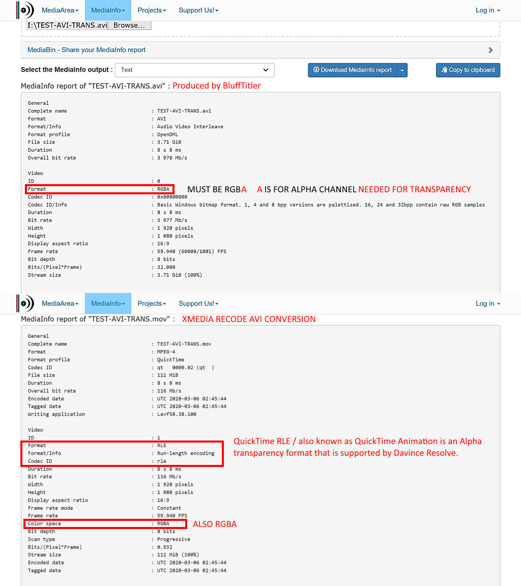 On the bottom you can see the converted MOV file. It must be in the RLE / QuickTime Animation format to work in Resolve, and is also RGBA.