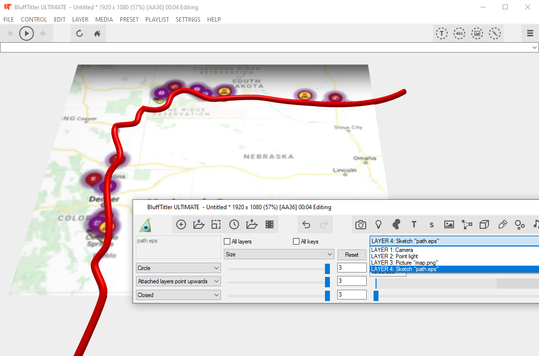 Michiel, I purchased Bixeangelo quite a while ago but have never used it. I open it up today and figured out how to import a copy of my background map and then draw a line around the path and save it as an eps file. I then open up a new show in BT and added a Sketch layer and added my new esp file but now I have no idea of what to do with it. Do you know of anyone who has created a tutorial video, maybe a YouTube video, of how complete the process of having an animated road map with some sort of object following the path that I could go view?