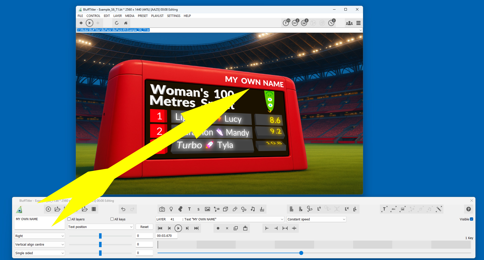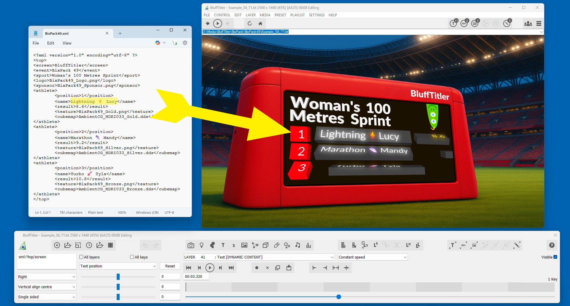 In the top screenshot you can see that layer 41 (a text layer) uses the text: xml:?top/screen. This tells BluffTitler to load the text from the XML file.