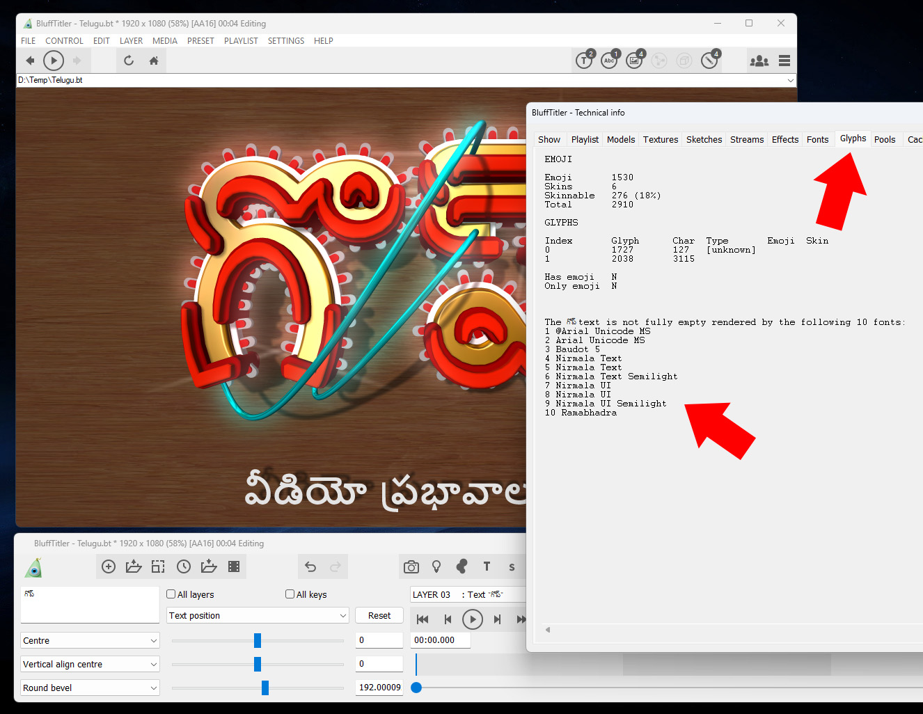 For this reason BluffTitler does not automatically use a replacement font for the missing glyphs.