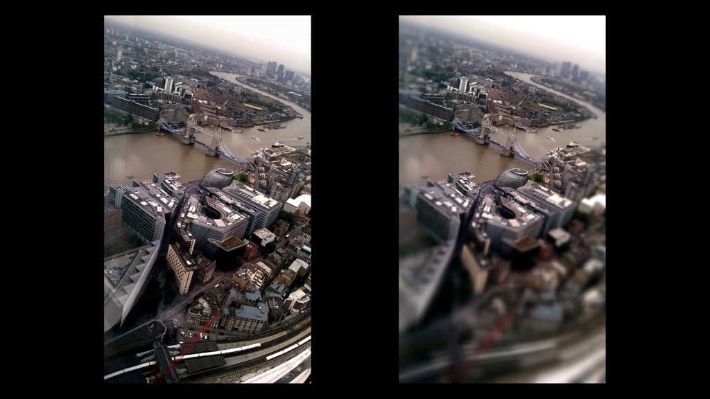 The photo shows the Tower Bridge in London as seen from the 72th floor of the Shard. The left is the original, the right is the same photo with the TiltShift effect applied. As you can see it now looks like a miniature city :)